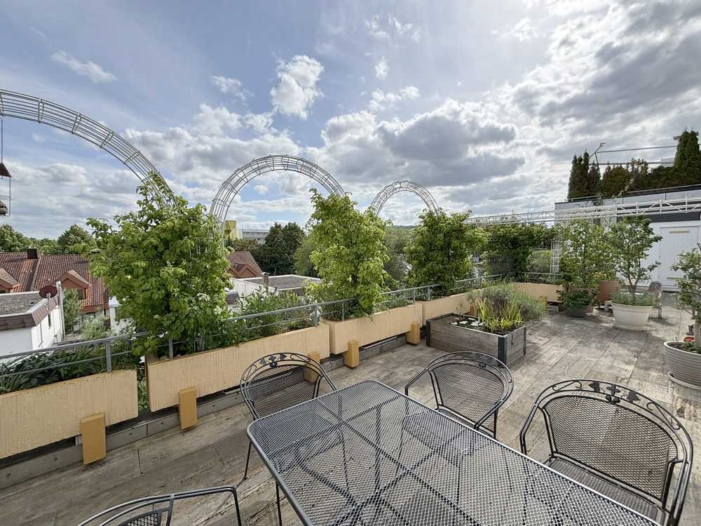 Diese außergewöhnlich helle und großzügig geschnittene Wohnung bietet mit ca. 155 m² Wohnfläche und 3,5 Zimmern ein besonderes Wohnerlebnis. Sie wurde 1985 erbaut, im vergangenen Jahr zuletzt modernisiert und befindet sich in einem ausgesprochen gepflegten Zustand. Das absolute Highlight ist der imposante Wohn- und Essbereich, der giebelhoch offen gestaltet ist und so ein einzigartiges Raumgefühl sowie eine beeindruckende Akustik schafft. Ein Kamin im Wohnbereich sorgt für wohlige Wärme an kalten Tagen, während der leicht erhöht gelegene Essbereich sich harmonisch in das offene Raumkonzept einfügt. Von hier aus gelangt man auf die äußerst großzügige, nach Süden ausgerichtete Sonnenterrasse, die vielfältige Gestaltungsmöglichkeiten bietet – sei es für einen gemütlichen Essbereich oder eine entspannte Lounge-Ecke. Der Blick von der Terrasse ist unverbaubar und reicht weit über die Dächer der Nachbarschaft bis ins Grüne. Die separate Küche, die sowohl vom Wohn- als auch vom Essbereich zugänglich ist, präsentiert sich in einem äußerst gepflegten Zustand, einem zeitlosen Design und bietet alles, was für den täglichen Gebrauch erforderlich ist. Ein weiterer Pluspunkt ist der angrenzende Arbeitsbereich, der ebenfalls Zugang zur Terrasse hat und sich ideal für Homeoffice oder kreative Projekte eignet. Am Ende des Flurs befindet sich das geräumige Hauptschlafzimmer mit direktem Zugang zum Tageslichtbad en Suite, das mit einer Eckbadewanne, einem Doppelwaschtisch und einer Dusche höchsten Komfort bietet. Ergänzt wird das Raumangebot durch ein weiteres Duschbad, ein Gäste- oder Kinderzimmer sowie ein separates WC. Zwei zur Wohnung gehörende Garagen bieten zusätzlichen Komfort und runden das Angebot ab. Diese Wohnung verbindet Großzügigkeit, Eleganz und eine durchdachte Raumaufteilung zu einem besonderen Wohnambiente – perfekt für alle, die Wert auf Wohnqualität und stilvolles Design legen.