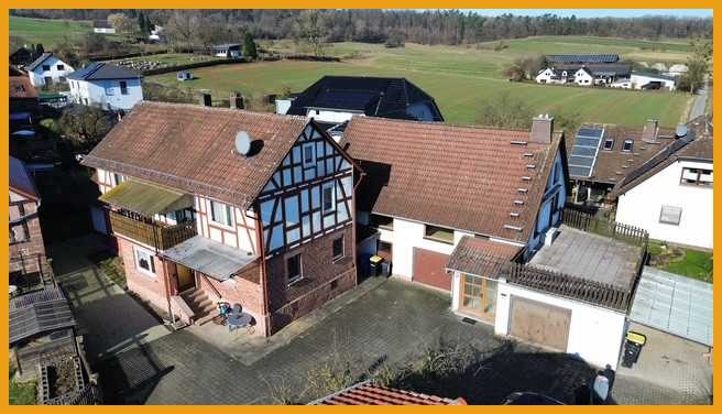 Das an eine ältere Dame vermietete Haupthaus, welches in Teilen in Fachwerk errichtet wurde, bietet Ihnen im Erdgeschoss ein Esszimmer, ein Wohnzimmer, ein Schlafzimmer mit Dusche und WC, die Küche und ein separates Badezimmer mit Wanne aus den 80er Jahren. Das Obergeschoss gliedert sich auf in zwei weitere Schlafzimmer, ein Durchgangszimmer und einen Büroraum. Das Gebäude ist teilunterkellert, über den Hof gelangen Sie in den Keller-/Vorratsraum. Das Haus erzielt aktuell eine Nettomiete von 7.200,-€ p.a. Neben den Garagen stehen ein Carport und ein Außenstellplatz zur Verfügung. Das anliegende Garten-Grundstück mit Garage und der Flurstücks-Nummer 5/6 mit 621 m² ist grundsätzlich bebaubar und kann optional hinzuerworben werden.