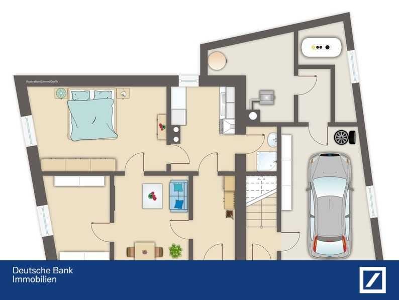Durch eine Tür im Treppenhaus erreicht man die Garage, durch die man den Vorratsraum als auch den Heizungsraum erreicht.
