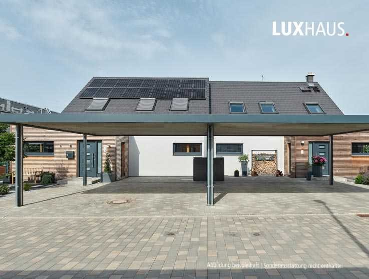 Modern interpretierte Satteldach-Doppelhausarchitektur mit viel Liebe zum Detail. Die leicht auskragenden Erker mit grauem Akzentelement, die Lärchenschalung, die reduzierten, aber hochmodernen Carports und die prägnanten dunklen Elemente verleihen dem großzügigen Doppelhaus Eleganz und Exklusivität.