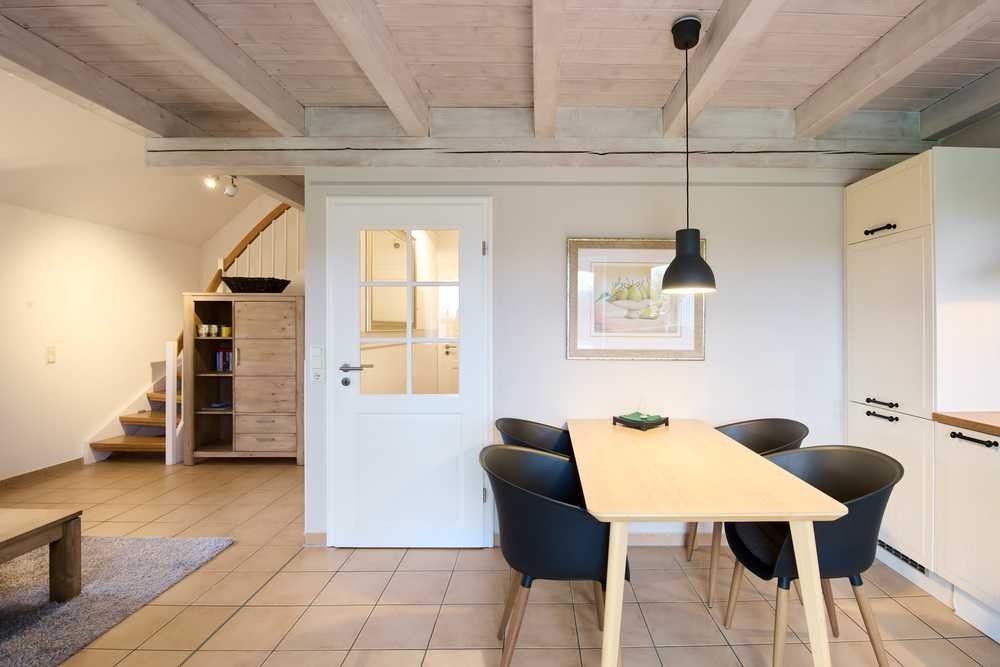 Am Ende des Flures befindet sich der fast 29 m² umfassende und damit recht großzügige Wohn- und Essbereich, zur linken Hand mit einer schicken Küchenzeile und einem passenden Esstisch ausgestattet, und bietet ausreichend Bewegungsfreiheit für 2-4 Personen. Die Küche ist, wie es sich für eine Ferienwohnung gehört, komplett ausgestattet mit Geschirrspüler, Backofen, Ceranfeld, Kühl- und Gefrierschrank. Zur rechten Hand öffnet sich der Wohnraum bis zur angrenzenden Außenwand und bietet damit viel Platz für gemütliche Abende auf Sofa und Sessel. Bemerkenswert sind die historischen Details wie zum Beispiel die tiefen Bogenfenster, die stilecht sich nach außen öffnenden Holz-Sprossenfenster oder die Holzdecken mit den dicken Querbalken, die den Charme vergangener Tage neu versprühen.