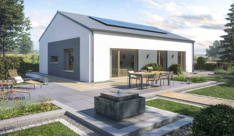 "Das erste Haus baust du für deinen Feind, das zweite für deinen Freund und das dritte für dich selbst", sagte einst Konfuzius. Diese Weisheit ist heute längst überholt. Denn wer sich bereits vor Planungsbeginn mit seinen Wünschen und den zukünftigen Anforderungen an sein Traumhaus auseinandersetzt, der wird ein Leben lang Freude daran haben. Wie so ein weitsichtig geplantes Zuhause aussehen kann, veranschaulicht beispielhaft dieser elegante Bungalow. Von außen präsentiert sich das Fertighaus sehr schlicht mit einem modern interpretierten Satteldach. Der quaderförmige Baukörper wird durchbrochen von geschickt platzierten Lichtöffnungen, die von schlanken Fensterbändern bis hin zu breiten Glasfronten auf der Gartenseite reichen. Spannung erzeugt das Wechselspiel verschiedener Oberflächen. Die strahlend weiße Putzfassade bildet dabei die passende Bühne für eine individuelle Gestaltung: Sie wird akzentuiert durch die grau abgesetzten Flächen sowie durch die hellen Holzfensterrahmen. Natürlich kann sich die Baufamilie auch für eine andere Farbkombination entscheiden. So zeigt etwa ein fröhlicher Gelb- oder Orangeton schon von außen an, wie viel Lebensfreude im Innern des Hauses steckt. Mit einer Wohnfläche von mehr als 110 m² findet eine vierköpfige Familie hier bequem Platz. Fließende und stufenlose Übergänge sorgen nicht nur für Komfort im Hier und Jetzt, sondern bieten auch beste Voraussetzungen für ein langes selbstbestimmtes Leben in den eigenen vier Wänden. Die Diele mündet in den offen gestalteten Wohn-, Ess- und Kochbereich, der den gemeinsamen Aktivitäten gewidmet ist. Wer eine Auszeit vom turbulenten Familienalltag braucht, kann sich in einen der Privaträume zurückziehen. Mit zwei Kinderzimmern und einem Elternschlafraum inklusive Ankleide finden alle großen und kleinen Bewohner einen Bereich, der nur ihnen gehört. Ergänzt werden die Privaträume von einem Wellnessbad mit Dusche und Wanne sowie einem separatem Duschbad für den Nachwuchs. Die Haustechnik ist ebenfalls ebenerdig im Hauswirtschaftsraum untergebracht. Wer mehr Platz benötigt, kann seinen Bungalow auch unterkellern lassen.