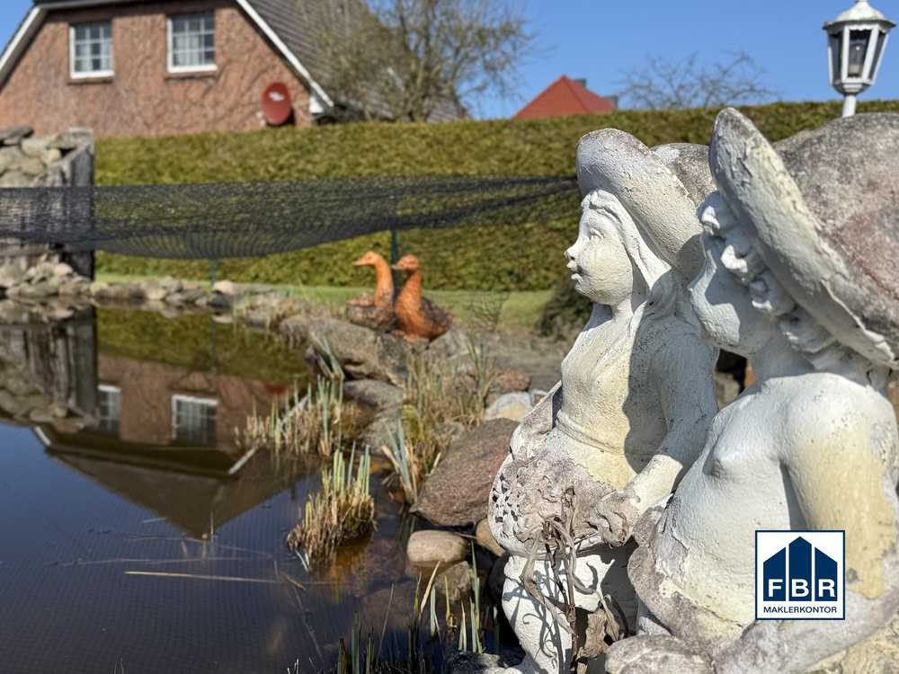 Der Außenbereich der Immobilie kann ebenso mit Highlights aufwarten: So ist ein Teich, ein in den Boden gelassenes kleines Schwimmbassin sowie eine besonders gestaltete Grillterrasse entstanden. Darüber hinaus befinden sich im hinteren Teil des Grundstückes eine attraktive Ziermauer, welche den Nutzgarten mit Gewächshaus und eine Gartendusche beherbergt.