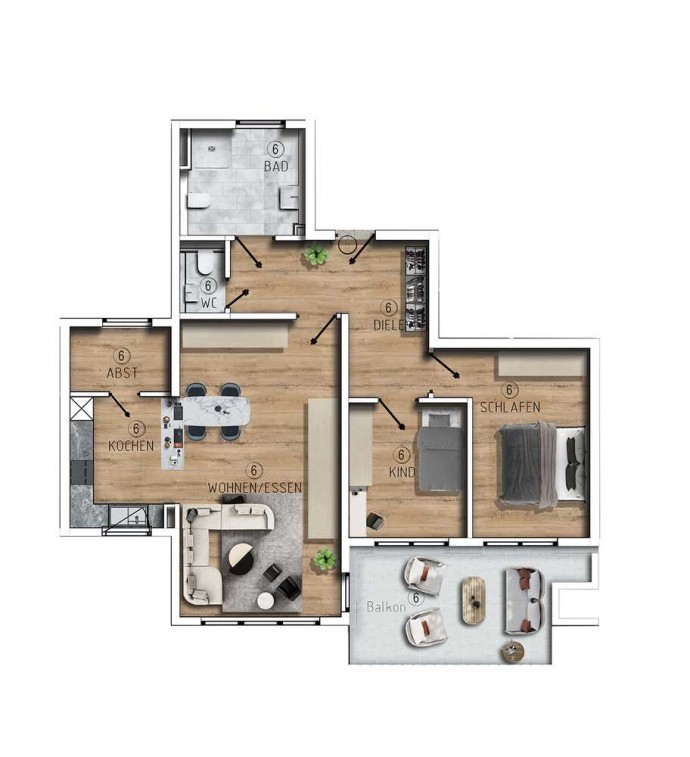 Alle Wohnungen haben eine Terrasse oder einen Balkon. Weiterhin sind alle Wohnungen mit einem Personenaufzug von der Tiefgarage oder der Haustüre erreichbar.