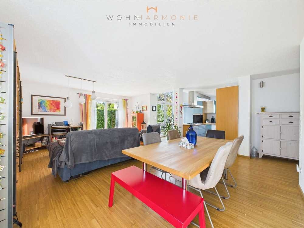 Im Erdgeschoss befindet sich der durch die große Fensterfront lichtdurchflutete Wohn- und Essbereich mit offener Einbauküche und Zugang zur Terrasse und separatem Abstellraum mit bodentiefem Fenster.