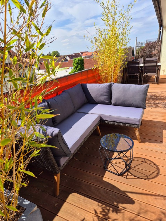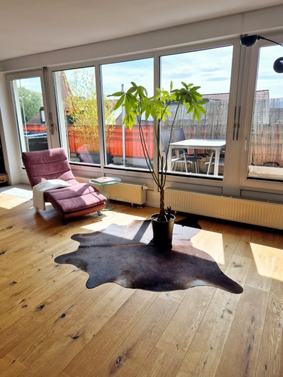 Highlight der Wohnung ist der beeindruckend große Wohn- und Essbereich mit einer breiten, hellen Fensterfront, die viel Tageslicht hereinlässt und den Raum mit einer offenen, freundlichen Atmosphäre erfüllt. Direkt angeschlossen lädt die großzügige Dachterrasse zum Entspannen und Genießen ein – sie bietet ausreichend Platz für einen Esstisch sowie eine Lounge-Sitzgruppe.