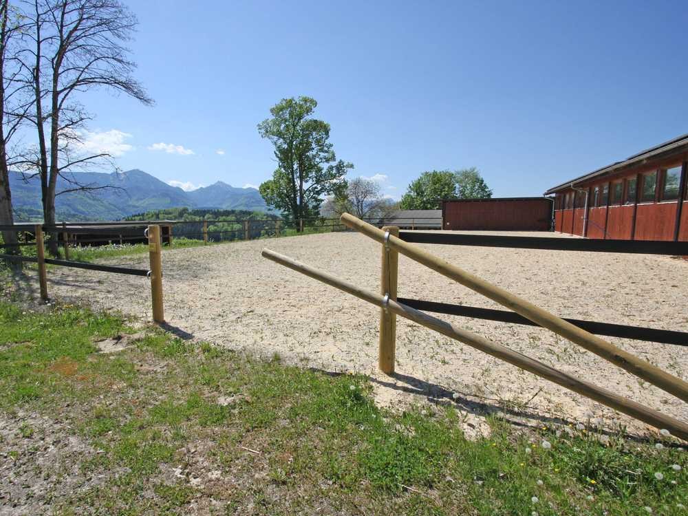 In schöner Aussichtslage mit Blick auf Wiesen und Felder, bis weit in die Berge, befindet sich eine Reitanlage mit Einstellmöglichkeiten für derzeit 22 Pensionspferde. Eine Erweiterung um 8 Boxen ist zusätzlich möglich.