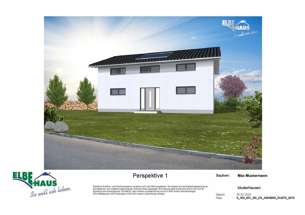 Dieses innovative Elbe-Haus® wird in massiver Bauweise von qualifiziertem Fachpersonal errichtet. Wir planen und projektieren nach Ihren Vorstellungen und Wünschen und somit ist wirklich jedes Haus einzigartig. Beachten Sie bitte, dass das abgebildete Haus lediglich ein Bebauungsbeispiel ist. Das Grundstück kann unter Berücksichtigung der örtlichen Bauvorschriften mit Ihrem Wunschhaus von Elbe-Haus® errichtet werden.
