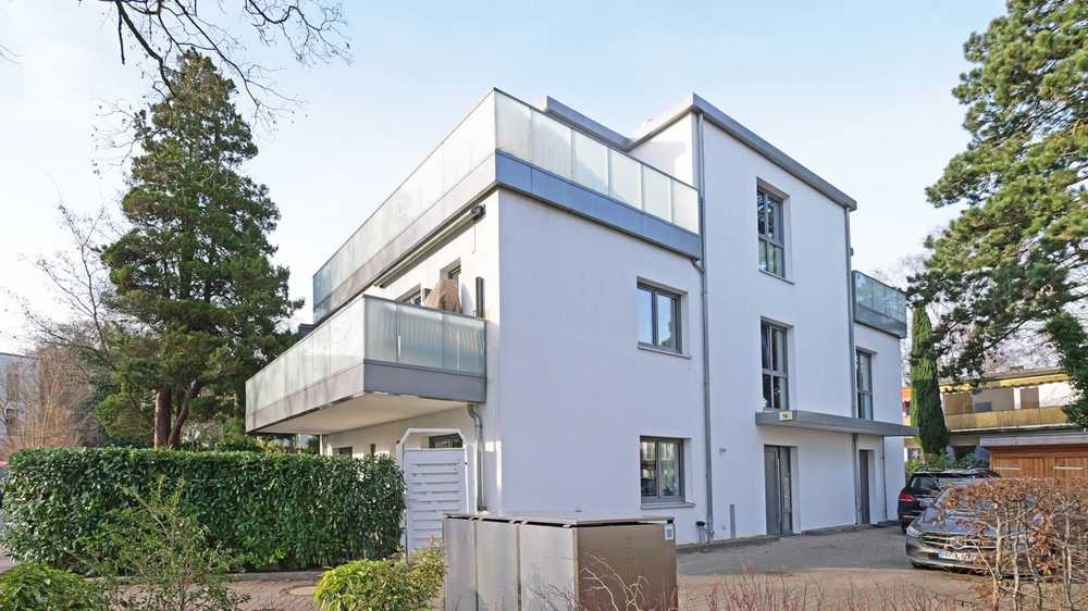 Dieses im Jahr 2015 errichtete Mehrfamilienhaus besticht in seiner Form durch klare Linien sowie eine moderne Bauweise mit einer weißen Putzfassade und grauen Fenster- und Türelementen.