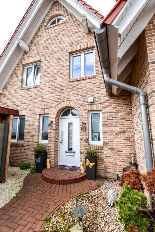 Beim Bau des Objektes wurde viel Wert auf eine tolle optische Ansicht gelegt. Die Optik der Verklinkerung und des Gesimses sind im Landhausstil. Im Wohnzimmer wurde die Treppe integriert, so das Erdgeschoss und Obergeschoss miteinander verbunden sind.