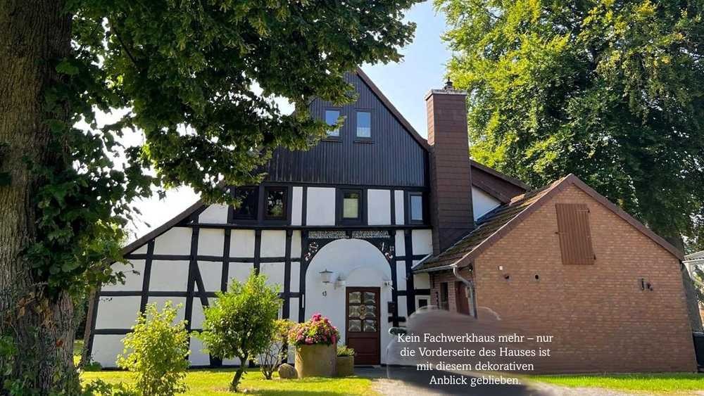 Das Haus ist dreiseitig mit rotem Klinker verkleidet. Die Vorderfassade erinnert mit ihrer nostalgischen Inschrift an das ursprüngliche Fachwerkhaus – ein dekoratives Detail, das bei Bedarf problemlos entfernt werden kann, da das zweite Obergeschoss nur optisch als Fachwerk ausgeführt ist.