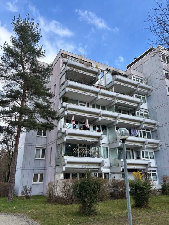 Die geräumige 4-Zimmer-Wohnung liegt im 5. Und letzten Obergeschoss eines im Jahre 1976 errichteten Mehrfamilienhauses mit insgesamt 10 Wohneinheiten. Die Wohnung ist bequem mit dem Lift erreichbar. Über den Flur gelangen Sie in alle Räume. So ist das Wohnzimmer mit der Küche verbunden und bietet direkten Zugang auf den großen, nach Süden gerichteten Balkon mit neuer Markise. Das Schlafzimmer ist aufgrund seines guten Schnittes gut zu möblieren. Die zwei Kinderzimmer sind jeweils unter 10 qm groß, bieten aber ausreichend Platz. Eine Abstellkammer ist ebenfalls vorhanden. Das Badezimmer wurde 2020 saniert und mit einer bodenbündigen Dusche und einem großen Waschtisch versehen. Das Bad verfügt zudem über einen Waschmaschinenanschluss. Die separate Toilette wurde erst letztes Jahr erneuert. Erst letztes Jahr wurden alle Fenster erneuert. Die Wohnung steht leer und kann jederzeit besichtigt werden.