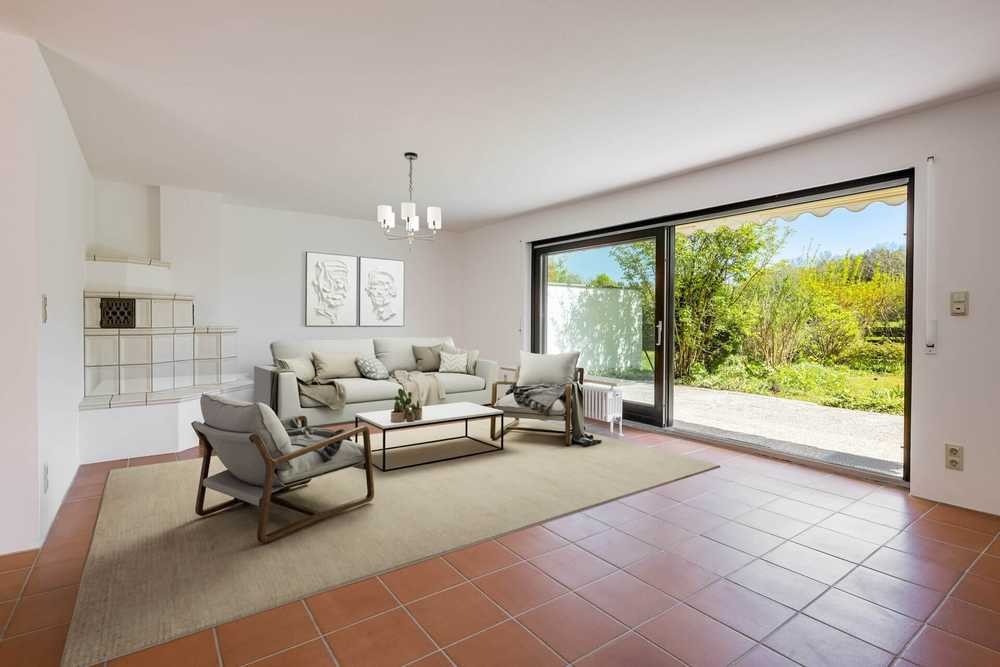 Der großzügige Wohn- und Essbereich bietet viel Raum, um Ihre Vorstellungen von schönem Wohnen zu verwirklichen. In den kalten Monaten werden Sie die angenehme Wärme des Kachelofens genießen, die dank des Kaminschachts auch noch im Obergeschoss zu spüren ist. Direkt an das Wohnzimmer schmiegt sich die sonnige Südterrasse an. So können Sie Ihr Leben an lauschigen Sommertagen bequem ins Freie verlagern, Feste feiern, entspannen und die wohltuende Wirkung der Natur genießen. Für Kinder bietet der geschützte Garten eine wunderbare Gelegenheit, draußen zu spielen.