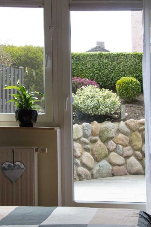 Von diesen beiden Räumen erreichen Sie die von außen nicht zugängliche, geschützte, ca 18m² große und nach Süden ausgerichtete Terrasse. Diese ist mit Granitplatten belegt und mit einem Wall aus Natursteinen sowie einer Buchsbaumhecke eingefasst.