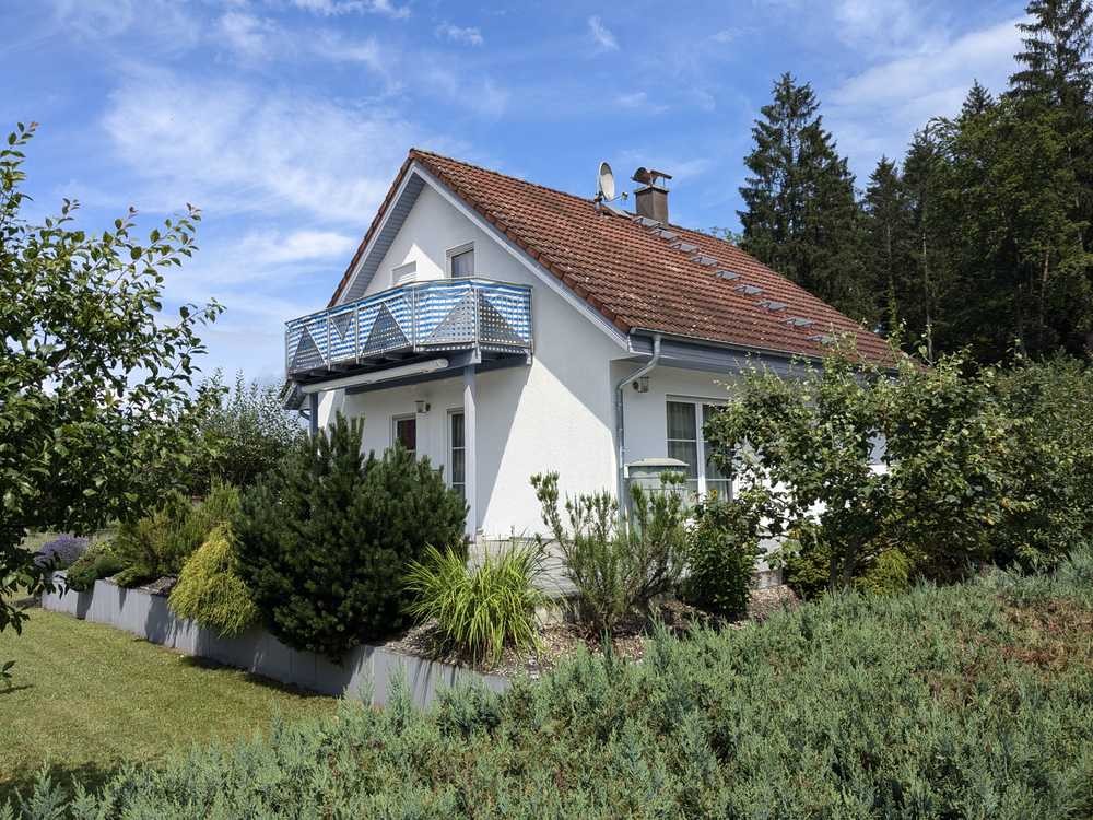 Das zweistöckige Niedrigenergie-Haus ist auf einem massiven Keller errichtet. Das Grundstück hat einen mit Obstbäumen angelegten Garten und ist mit einer grünen Hecke umzäunt.