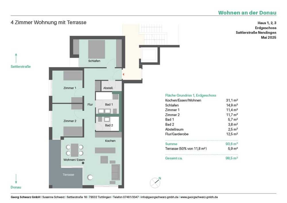 In Tuttlingen-Nendingen bauen wir drei Wohnhäuser mit verbindender Tiefgarage und einen vorgelagerten Gewerbebau, der zur Straße abriegelt. Die Wohngebäude stehen also geschützt der Donau zugewandt, das großzügige Gelände bietet Familien viel Freiraum, die Donau Abenteuer pur.