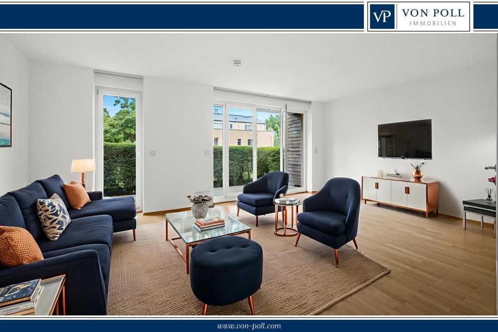 Das Herzstück der Wohnung ist der licht-durchflutete Wohn-/Essbereich. Diverse bodentiefe Fensterelemente und die Flügeltüren zur Terrasse sorgen für idealen Lichteinfall. Von hier haben Sie einen herrlichen Blick ins Grüne und auf das parkähnliche Grundstück.
