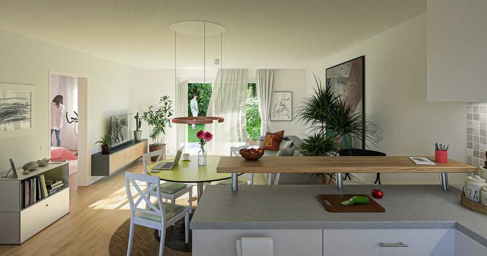 Eine großflächige Photovoltaikanlage auf den Dächern sorgt für umweltfreundliche Energiegewinnung. In Kombination mit modernster Haustechnik entstehen so zukunftsorientierte Wohnräume mit niedrigem Energieverbrauch.