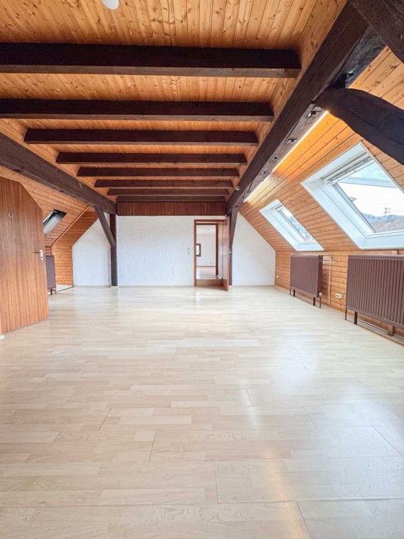 Im Eingangsbereich der Wohnung befinden Sie sich direkt im sehr großen Wohnbereich zur individuellen Gestaltung. Vom loftähnlichen Wohnbereich mit sichtbaren Dachsparren und neuwertigen Dachflächenfenstern gelangen Sie in zwei Schlafräume, das Gäste-WC mit Tageslicht, in die Küche sowie auf die großzügige und überdachte Dachterrasse. Von der Küche aus gelangen Sie über einen langen Flurbereich in den hinteren Teil der 5-Zimmer-Dachgeschosswohnung. Hier befindet sich das Elternschlafzimmer, ein Badezimmer mit WC und Dusche sowie ein weiteres kleines Zimmer, welches sich ideal als Arbeitszimmer eignet. Die Wohnung verfügt über Abstellflächen, welche entsprechend genutzt werden können.