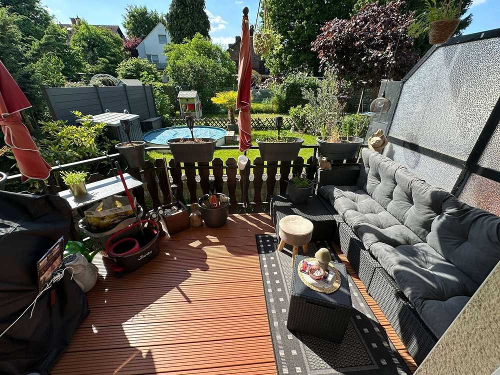 Das Wohnzimmer ist ebenfalls mit Fliesen ausgestattet und durch das Wohnzimmer gelangt man auf den überdachten Balkon (Loggia). Der Garten steht allen Bewohnern des Hauses zur Verfügung.