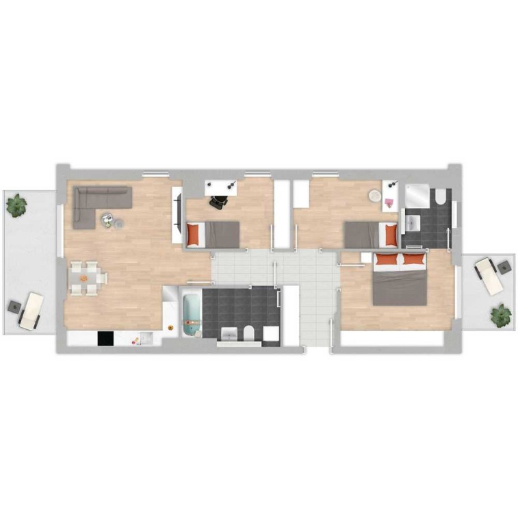 Der Mittelpunkt der Wohnung ist der offene Wohn-, Ess- und Kochbereich mit Zugang zu einem großzügigen Balkon in West-Ausrichtung – ideal für sonnige Nachmittage und geselliges Beisammensein. Der zweite Balkon liegt am Schlafzimmer und bietet morgens Licht aus dem Osten – perfekt für einen ruhigen Start in den Tag.