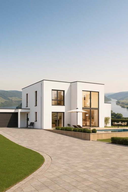 Zwei Vollgeschosse ohne Dachschrägen sorgen für optimale Nutzbarkeit jeder Fläche, während das elegante Flachdach die moderne Linienführung der Architektur perfekt ergänzt.