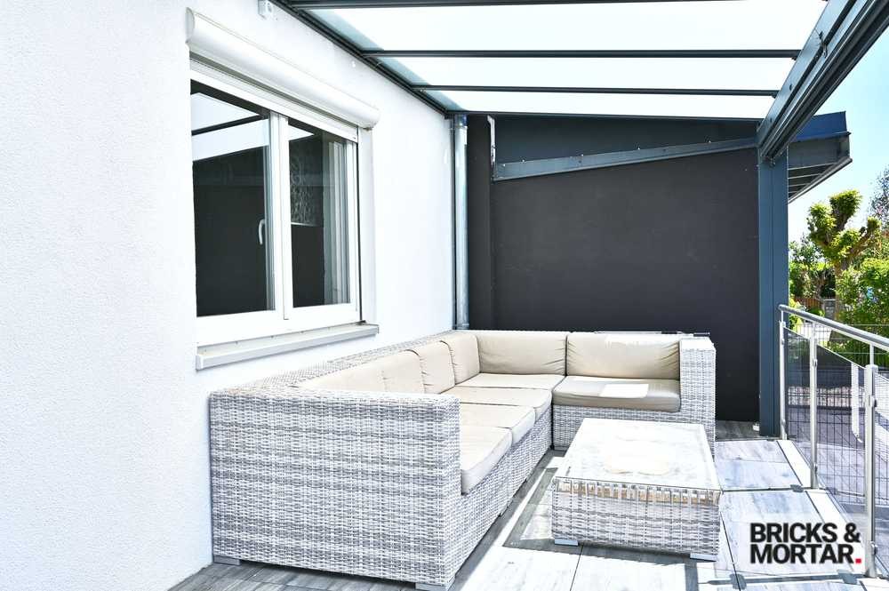 Die großzügige Terrasse mit Überdachung und elektrischer Beschattung, sowie Klarglas Balustrade mit Edelstahlgeländer verleihen dem gesamten Erscheinungsbild des Hauses ein modernes Bild.