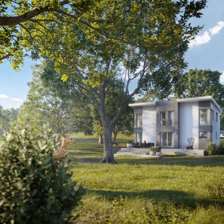 Das Haus ist auf einem realen Baugrundstück geplant oder auf einem Grundstück in einer Planungsphase. Die Bilder zeigen ggf. Extras, die im Rahmen des Bebauungsplans noch geprüft werden müssen.
