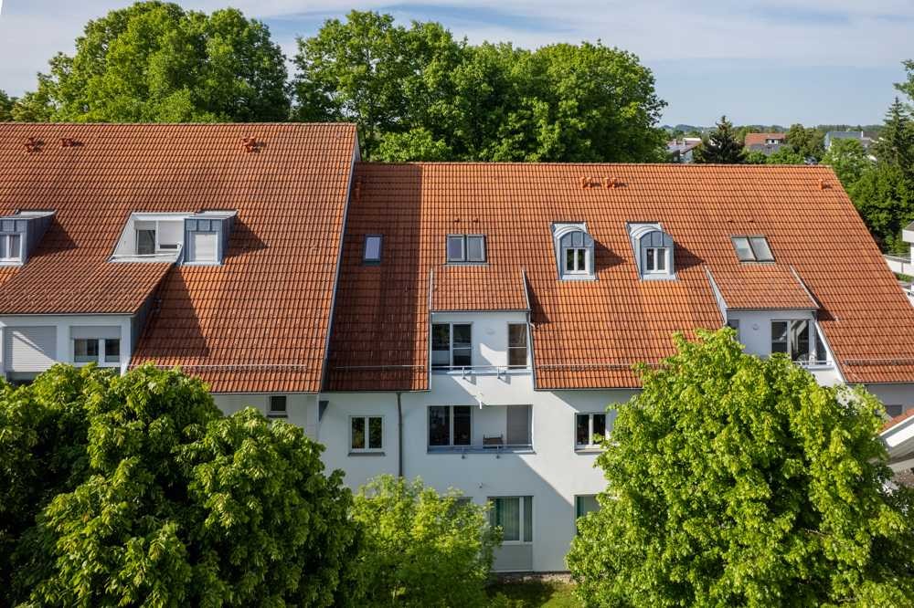 Der zentrale Mittelpunkt der Wohnung ist das großzügige Wohn- und Esszimmer mit direktem Zugang zum Südwest-Balkon. Große Fensterflächen lassen viel Tageslicht einfallen und schaffen eine freundliche Atmosphäre, während die sichtbaren Dachbalken und die gemütliche Dachschräge dem Raum ein wohnliches Flair verleihen. Der angrenzende Balkon bietet einen ruhigen Außenbereich mit schönem Blick ins Grüne – ideal für entspannte Stunden im Freien.