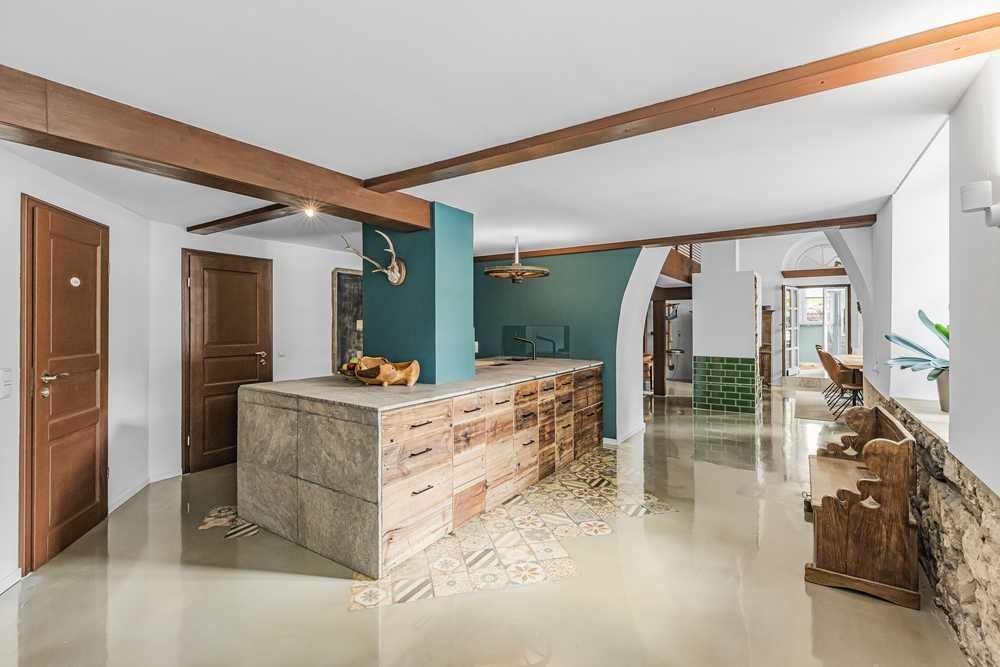Sie betreten den Vorraum der Wohnung durch eine historische, doppelflügelige Holztür. Anschließend betreten Sie den großzügigen, weitläufigen Wohnraum durch die offene, moderne Designer-Küche. Zu Ihrer Linken befindet sich ein sehr modern gestaltetes Gäste-Dusch-WC mit integrierter Waschmaschine und Wäschetunnel aus dem ersten Stock. Neben der Küche befindet sich ein Hauswirtschaftsraum. In den Wohn-Essbereich gelangen Sie durch zwei historische Gewölbe-Durchgänge, der lichtdurchflutete Wohn-Essbereich beeindruckt durch eine Deckenhöhe von über fünf Metern. Gleichzeitig bietet der Wohnbereich unter der Galerieebene einen gemütlichen Rückzugsort mit Blick in den ersten Stock durch die teilweise verglasten Galerieböden. An den Wohnbereich schließt sich ein weiteres (halbes) Zimmer an, welches sich z.B. als Büro oder auch Gäste-Zimmer nutzen lässt. Von dort aus gelangen Sie auf die kleine von Hecken geschützte Sonnen-Terrasse.