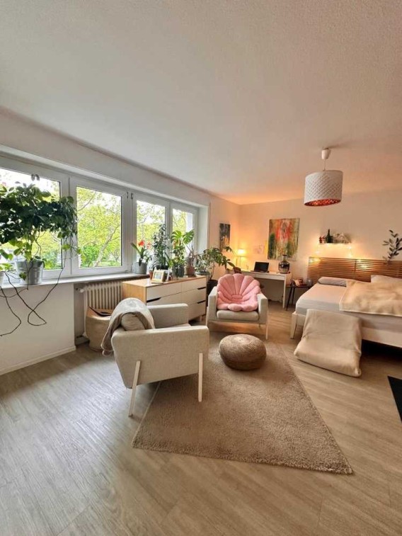 Der sehr großzügige, helle Wohn-/ Schlafbereich ist über den Flur zugänglich und mit einem Einbauschrank ausgestattet. Die kleine Wohnküche verfügt über eine hochwertige Einbauküche und grenzt an die Loggia in Westausrichtung.
