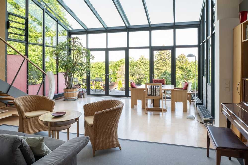 Highlights der großzügigen Wohnung über zwei Etagen sind der lichtdurchflutete Wohnbereich mit Wintergarten und hohem Luftraum und die daran anschließende großflächige Terrasse, die aufgrund der Hanglage einen freien und weitläufigen Blick ins Grüne ermöglicht.