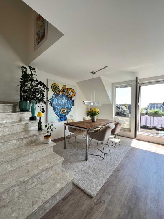 Die Wohnräume, die Diele und auch die Küche wurden 2021 mit einem hochwertigen Vinylboden ausgelegt. Zu diesem Zeitpunkt wurden ebenfalls beide Bäder aufwändig saniert (Ideal Standard, Duravit). Zudem wurden die Echtholzdielen in der oberen Etage aufbereitet. Der Wohnbereich besticht, wie die gesamte Immobilie, durch seine Helligkeit und bildet das Herzstück dieser Wohnung. Von hieraus haben Sie auch die Möglichkeit den mit Bangkirai und einer Markise versehenen Balkon in Südostlage zu betreten - via Doppelflügeltür. Auf dieser Ebene befindet sich darüber hinaus das Büro/Kinderzimmer, die geräumige Küche (AEG-Herd, Bosch-Kühlschrank, Neff-Spülmaschine), ein praktischer Abstellraum sowie ein Gäste-WC mit Dusche. In der oberen Etage befindet sich das geräumige Schlafzimmer inklusive direkt angrenzendem Badezimmer mit Duschwanne.