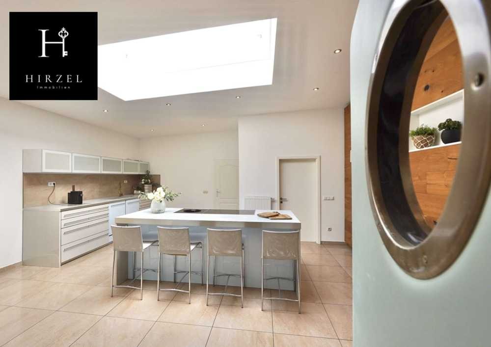 Durch die besondere Flügeltür gelangen Sie direkt zur modernen Küche mit riesiger Kücheninsel. Durch die Glaskuppel, direkt über der Kochinsel, spendet diese Ihnen genug Lichteinfall und dient perfekt zur Lüftung. Die Küche: Hier fangen die besten Party an!