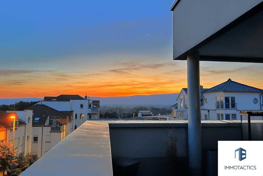 Der direkte Zugang auf die 42 qm große und überwiegend überdachte Dachterrasse bietet einen traumhaften Outdoorbereich, ideal für die perfekte Frühstückslounge sowie die abendliche Chillout-Zone. Mit beeindruckendem Panoramablick über die Dächer stilvoller Stadthäuser bis ins grüne, rheinhessische Hügelland.