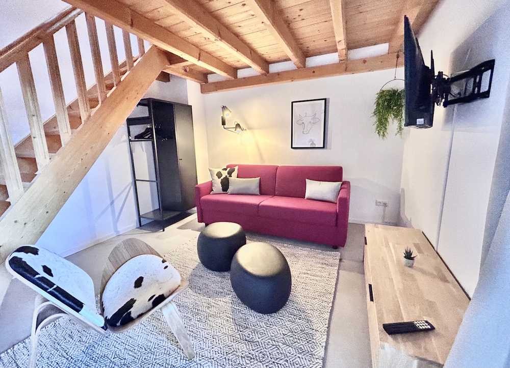 Das ca. 40 m² große Studio bietet Platz für bis zu 4 Personen und wurde mit viel Liebe zum Detail modern-bayerisch eingerichtet. Die offene Raumaufteilung schafft ein luftiges Wohngefühl: Im unteren Bereich befinden sich eine voll ausgestattete Küche, ein einladender Ess- und Wohnbereich sowie ein modernes Badezimmer. Highlight ist der gemütliche Balkon – perfekt für entspannte Stunden mit Bergluft und Sonne.