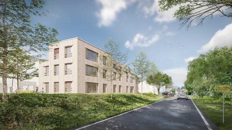 Das Gebäude wird vorwiegend in Holzbauweise als Energieeffizienzhaus40 errichtet.