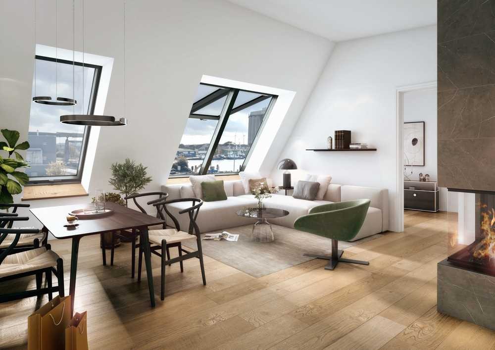 Die Whg. 04 ist als Erst- oder Zweitwohnsitz nutzbar. Die Wohnung hat insg. eine Wohn- und Nutzfläche von 72 qm. Sie befindet sich im Dachgeschoss des linken Gebäudeteils mit weiß-geschlemmter Klinkerfassade und dunklen Holz-Sprossenfenstern. Highlight ist der Ausblick aus den großen Dachflächenfenstern über die Kleikuhle und den Hafen bis in die Südermarsch. Die Raumhöhe ist teilweise bis zu 3,50m hoch. Eine ganz besondere Atmosphäre! Zur Wohnung gehört ein Balkon und ein PKW-Stellplatz unter der Carportanlage mit Gründach.