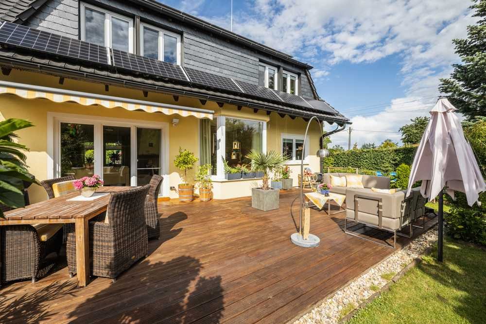 Das Haus ist umgeben von einem hochwertig bepflanzten und dennoch pflegeleichten Garten mit großem Erholungswert. Die Südwestausrichtung des Grundstücks sorgt für angenehme, warme Sommerabende auf der großen Terrasse.