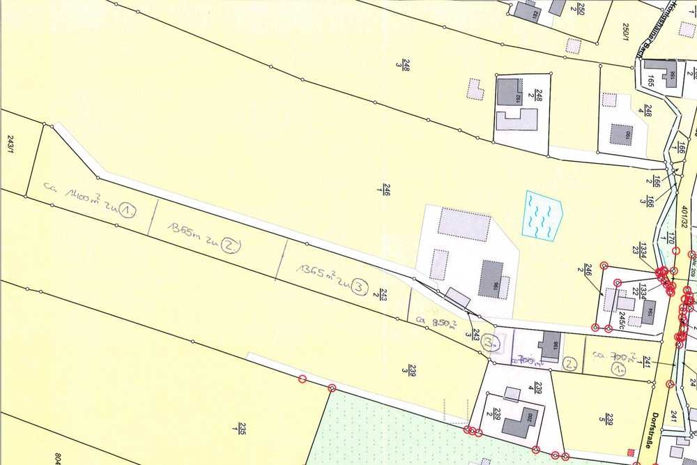 - Baugrundstücke 1 & 2 haben eine Größe von etwa 700m2. zusätzlich könnten noch jeweils etwa 1.400m2 Gartenland dazu gekauft werden.