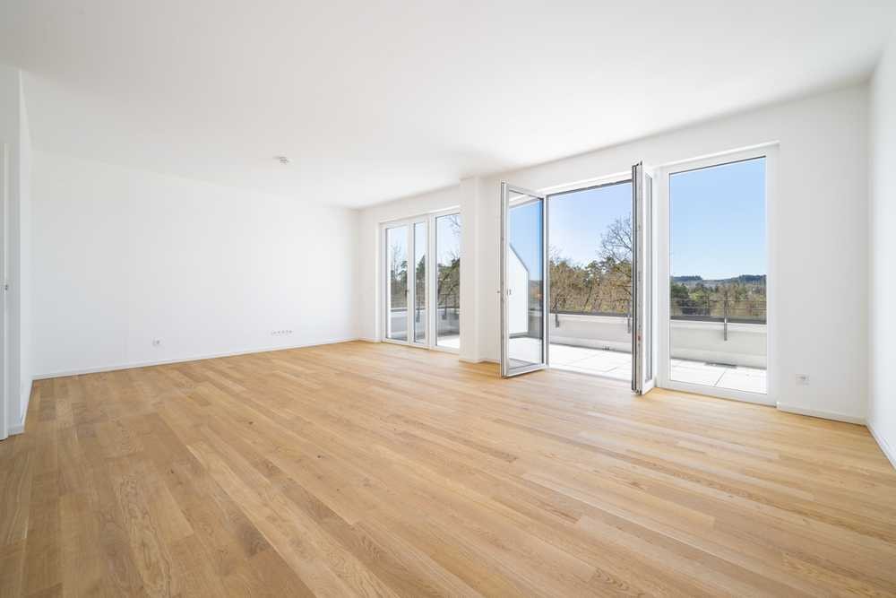 In dieser lichterfüllten, ca. 109 m² großen Wohnung verbindet sich elegantes Wohnen mit dem einmaligen Freiraum einer Ost/Süd/West Dachterrasse. Die direkte Lage am Waldrand eröffnet reizvolle Blicke über Wiesen und Felder.