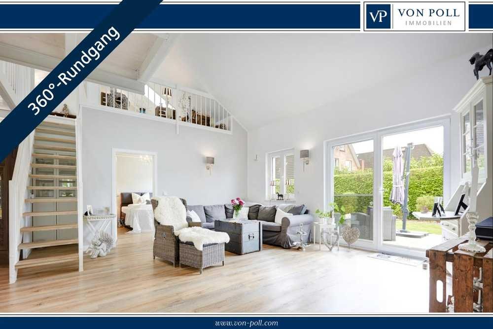 Dieser charmante Holz-Bungalow mit Satteldach befindet sich auf einem ca. 615 m² großen Grundstück und bietet im Erdgeschoss eine komfortable Wohnfläche von ca. 121 m². Eine teilweise eingezogene Galerie mit ausgebautem Dachgeschoss bietet weitere Nutzfläche und ermöglicht gleichzeitig im Wohnbereich eine offene Raumhöhe und ein großzügiges Raumgefühl, welches durch die bodentiefen Fensterelemente zum Garten unterstrichen wird.