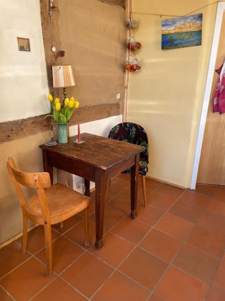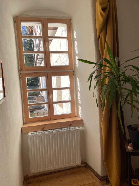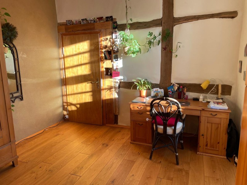 Unsere Wohnung im historischen Fachwerkhaus aus dem 16. Jahrhundert wurde 2022/23 mit viel Liebe und ökologischen Materialien saniert: Lehmputz in allen Zimmern, Dämmung der Außenwände, neue Heizkörper im Zuge der Umstellung auf eine nachhaltige Heizungsanlage. Die originalen Eichenbalken und freigelegtes Fachwerk sorgen für Charakter, neue Holzböden für ein warmes Wohngefühl. Morgens begrüßt dich die Sonne durch die nach Osten ausgerichteten Fenster. Die Ostterrasse hat einen direkten Zugang zum Garten. Die wunderschöne parkartige Gartenfläche von 2500m2 erstreckt sich vor allem über den hinteren Teil des Grundstücks. Es finden sich neben einem Gemüsegarten verschiedene alte Bäume, Wiesenflächen und historische Steinfundamente.