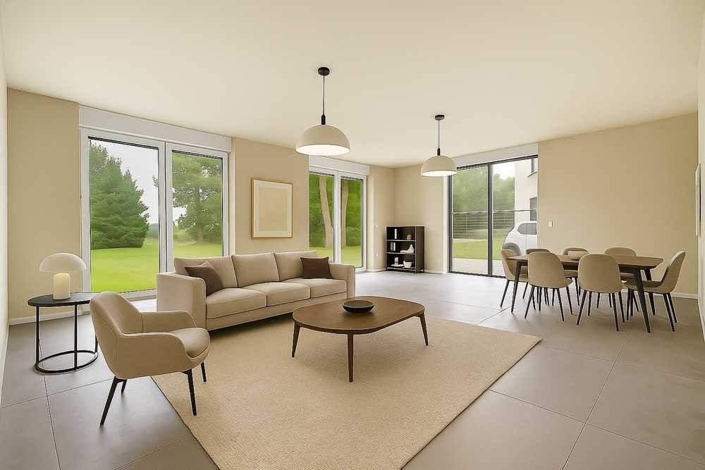 Wohnen mit Ausblick und Raum für Leben - Das Herzstück bildet das lichtdurchflutete Wohn- und Esszimmer im Erdgeschoss. Mit seinen umlaufenden Fensterfronten, der direkten Verbindung zur Terrasse und zum Garten schafft dieser Bereich eine einmalige Verbindung zwischen innen und außen. Ideal für gesellige Abende, entspannte Familienzeit oder repräsentatives Wohnen.
