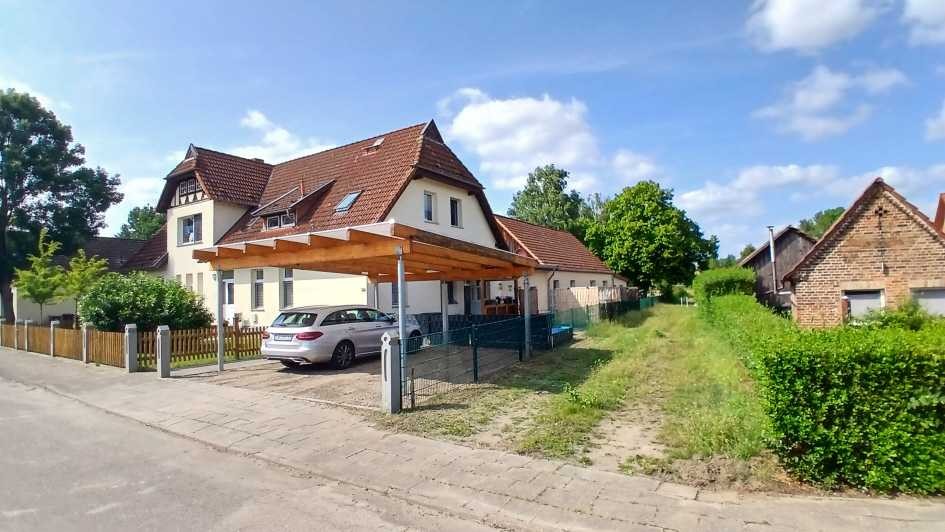 Auf dem Grundstück steht ein Stallgebäude, mit zwei Garagen und drei Schuppen, sowie zwei Doppelcarports und diverse Pkw - Stellplätze