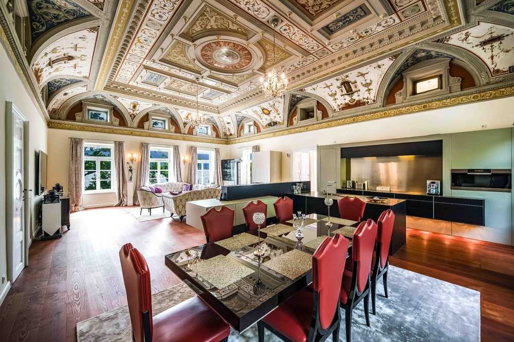 Im Bereich Wohnen finden Sie einen offenen, holzbefeuerten Kamin vor, in der - als Gegensatz zur historischen Stuckdecke - modern gestalteten Designer-Küche können Sie höchst professionell kochen und Ihre Gäste komfortabel im anschließenden Essbereich verwöhnen.