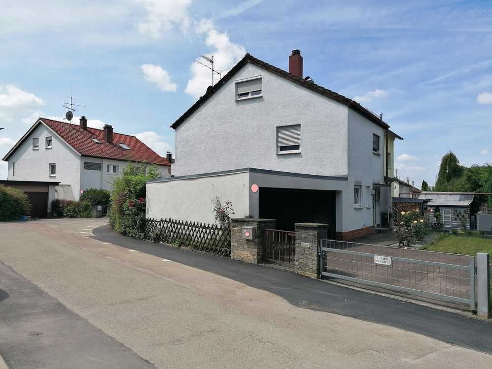 asphaltierter Garagenvorplatz und Waschbeton-Zuwegung zum Eingang, einfacher Vorgarten mit Jägerzaun, Hecke und einfache Gartenanlage mit Wiese