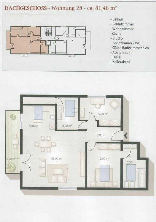 Diese hochwertige 3-Zimmer-Dachgeschosswohnung in einem KfW-55-Effizienzhaus im Schlosspark zu Schloss Winkel bietet ein besonderes Wohnambiente: lichtdurchflutete Räume mit hohen Decken, edle Materialien (Massivparkett, Feinsteinzeug, Kassettentüren), stilvolle Einbauküche inkl. Insel (Wert 4.000 €), großzügiger Balkon mit Weitblick.