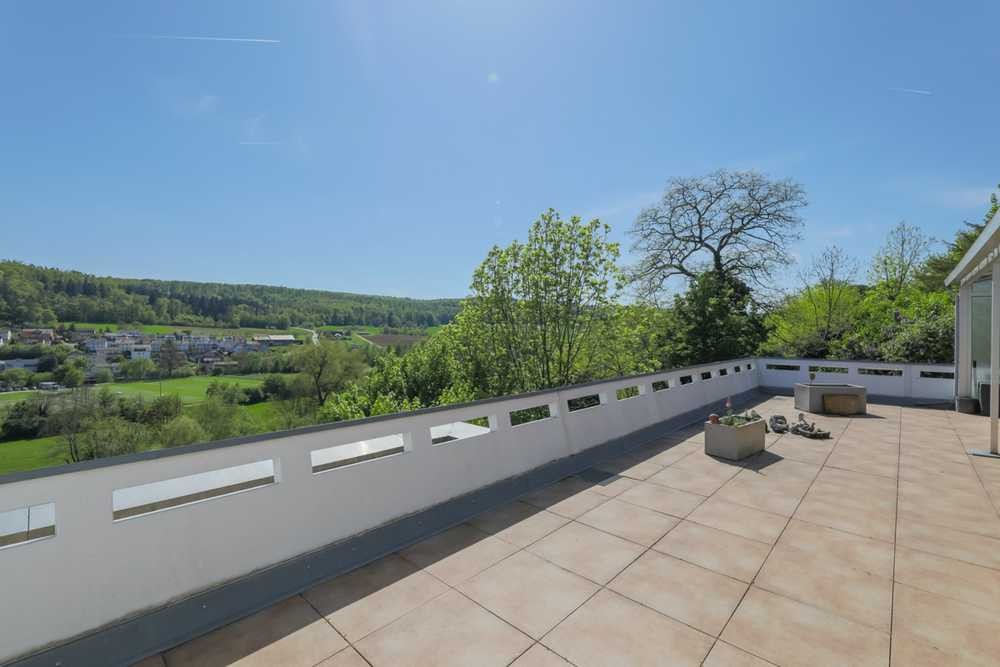 Auf die sonnige und teilweise überdachte Süd-Terrasse mit toller Aussicht entfallen zusätzlich ca. 54 m².