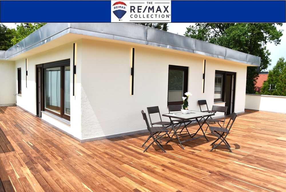 Die Dachterrasse mit einer Fläche von etwa 69 m² und Ost-/Süd-/ West-Ausrichtung lädt bis in die Abendstunden zum Entspannen ein. Von hier aus genießen Sie einen unverbaubaren Blick auf die umliegenden Gärten. Die Dachterrasse bietet einen idealen Ort, um schöne Tage mit Familie oder Freunden zu verbringen.